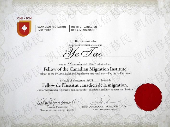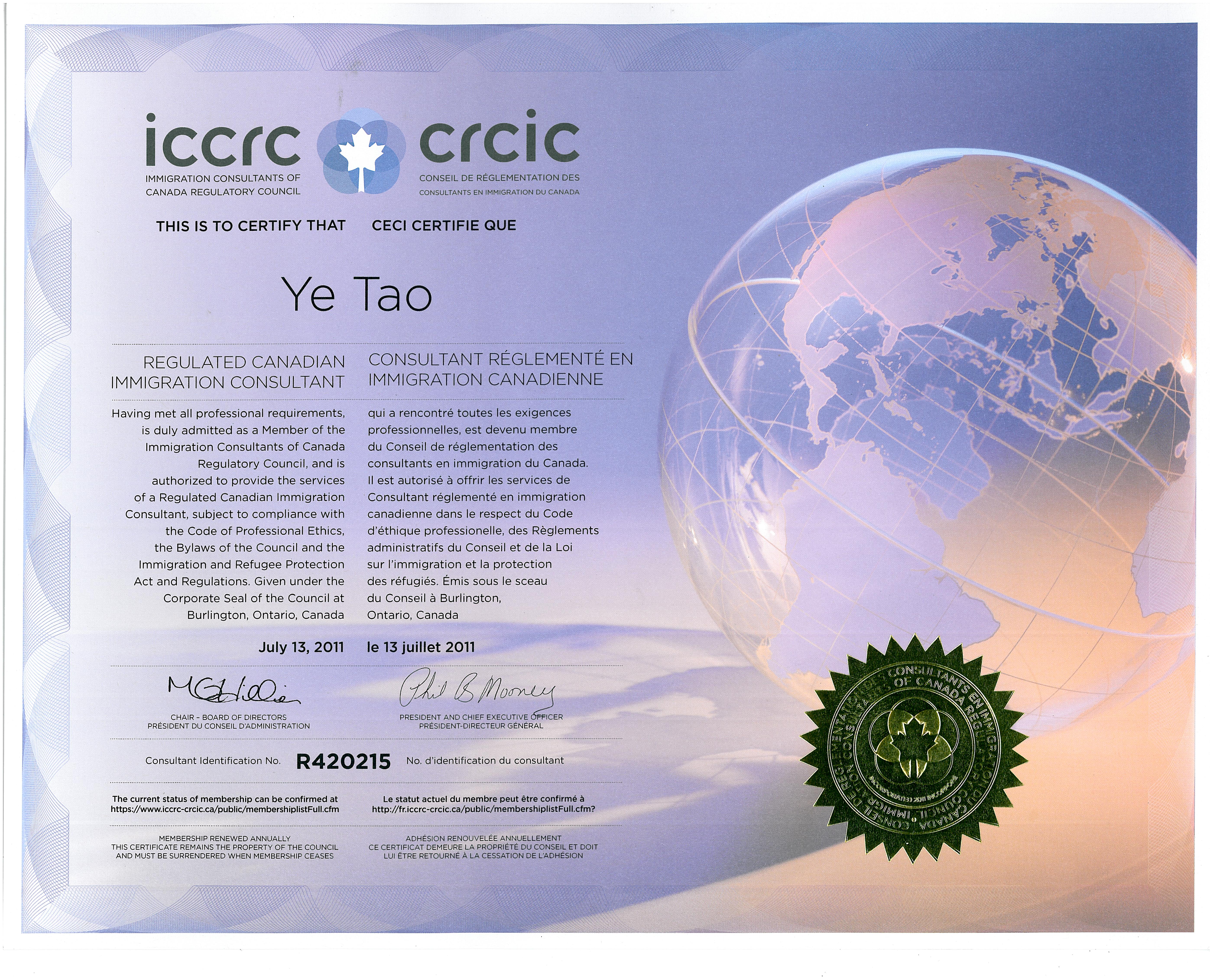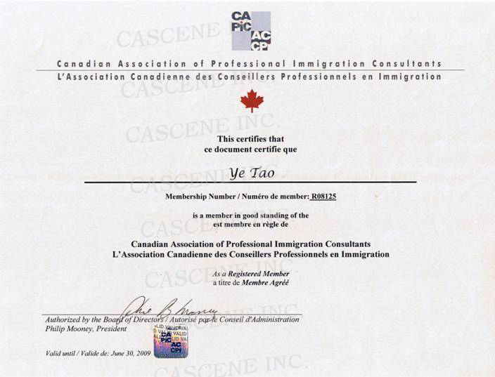 加拿大联邦移民顾问资格证书(C.S.I.C MEMBERSHIP CERTIFICATE) 加拿大移民顾问专业人士协会会员证书(CAPIC MEMBERSHIP CERTIFICATE)