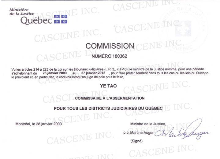 魁北克监誓师 (Quebec Commissioner of Oath Certificate) Lasalle College 指定国际留学代理证书 (Lasalle College Authorized Representative Certificate)